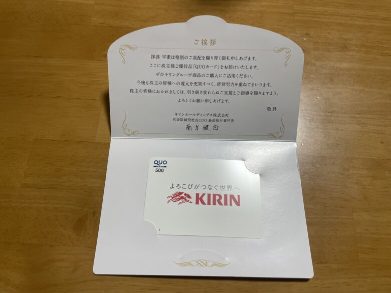 保有して3年未満では、このようにQUOカードが届きます。キリンのロゴはちょっとうれしいです。