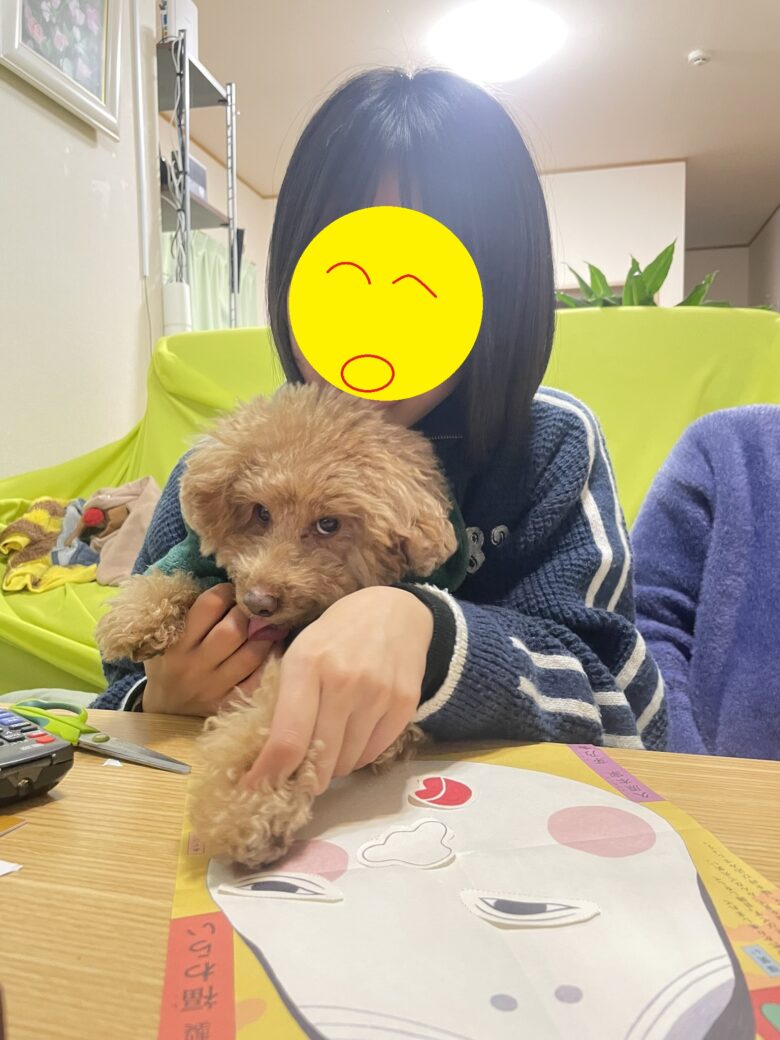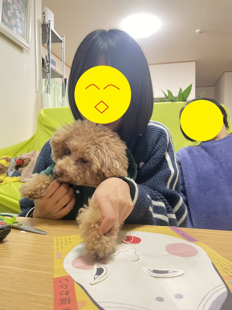 次女と一緒に福笑いを楽しむ(?)トイプードル